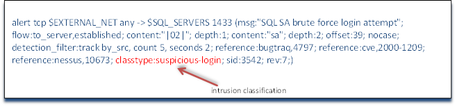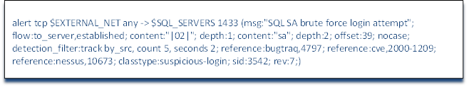The threshold levels are defined by the number of matches within a period of time. The keywords are relatively intuitive so that the number of matches is defined by the keyword count and the time period is defined by the keyword seconds. In our example rule, we have defined the threshold count as 5 within 2 seconds. This means that if we see five attempted brute force sa logins on our SQL Server application server within 2 seconds, send an alert. Anything less than this threshold level will be ignored. A couple of important notes here about these threshold level detection filters: First, count can be abbreviated as c and seconds can be abbreviated as s, so this detection level could have been written as detection_filter: track by_src c 5 s2. It is recommended, and considered a best practice, to use the full words count and seconds as it makes debugging more intuitive and therefore, much easier. Second, note that these threshold level parameters appear as a couplet like nearly everything else in the option's section of a Snort rule, but this couplet does not have a colon between the first and second part (there is no colon between count and 5, for instance). Third, the detection_filter applies to the entire rule independent of where it appears in the rule. It can be placed anywhere in the options section and applies to the threshold level of triggering the entire rule alert.