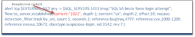 We should already be familiar with the header of this rule. The action is alert, the protocol is tcp, the source IP is a variable defined in snort.conf as $EXTERNAL_NET, the source port is any, the direction is -> toward our network, the destination IP is a variable defined in snort.conf as $SQL_SERVERS and the destination port is SQL Server's default port 1433. The message sent to the Snort admin is "SQL SA brute force login attempt" and the flow is to the server and established, but now we address some new fields and concepts in Snort rules when we come to the content keyword.