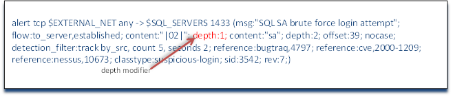 Immediately after that content couplet, we see a new keyword: depth. Depth indicates how many bytes into the packet the rule should count to find the content we are looking for. In this case, we are telling the Snort rule to look in the very first byte for this content. Putting such a limitation on the rule not only limits its false positives where such a character might appear somewhere else in the packet and not be malicious, but also makes it more efficient as the detection engine need only look in one place for the content and not the entire packet which can eat up significantly more CPU cycles.