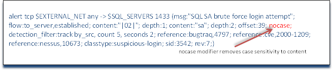 All content matching in Snort rules is case sensitive. If we want to search for content without regard to case, we can add the keyword nocase. As you see in our rule example here that we have added the word nocase which tells Snort to look for our content independent of case. This means that it would evaluate true for sa, SA, Sa, and sA.
