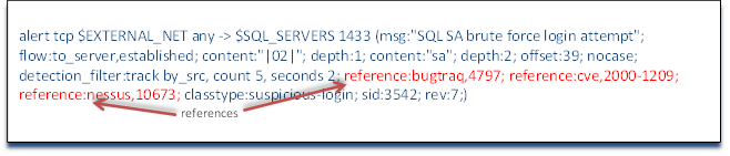 In our example rule, we can see that the first reference is bugtraq (reference:bugtraq,4797). The syntax here is the keyword reference, the reference source (in this case buqtraq) and the reference number within the source, in this case 4797. In this way, if this rule were to be triggered and we didn't understand what it was developed to detect, we could simply search online to www.securityfocus.com website. There we could search their bugtraq database for 4797 and would see that this is a vulnerability first reported May 22, 2002 that SQL Server 2000 had a default setting on the sa account without a password. It provides us with a plethora of information on each vulnerability or exploit that can be useful in deciphering what just took place on your network. In the case of 4797, the description reads, in part;