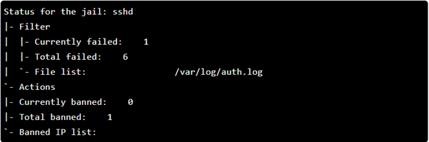 We can see above that fail2ban blocked one IP address after multiple failed login attempts.