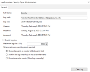 The size of your file is directly related to the amount of events that get generated and how far back you need to go. For example, with the current configuration on this system, the log is currently able to show data going back approximately one and a half months. That's not bad for a single workstation, but we're going to have significantly more data to parse through in a larger environment.