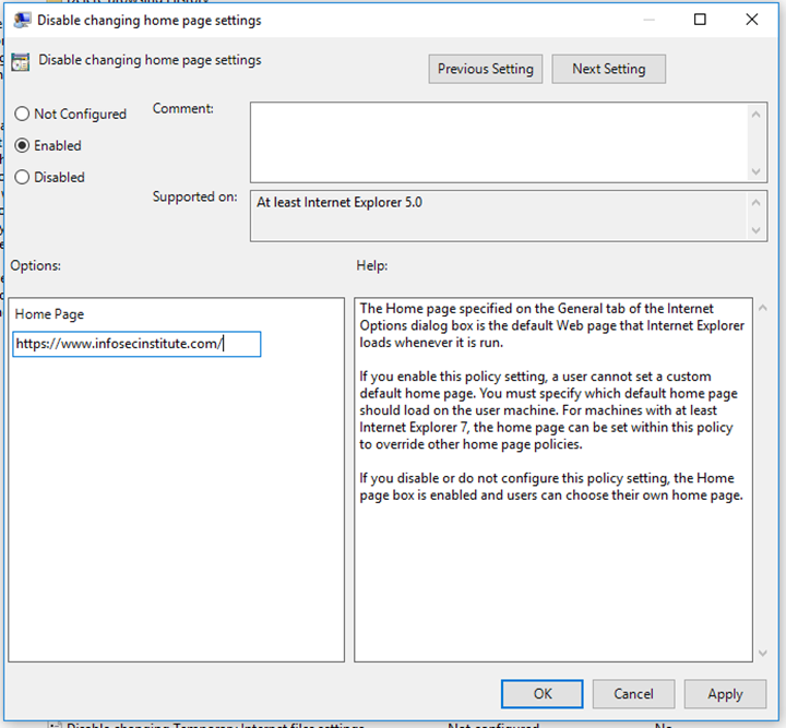 Once we have enabled this setting, the Home Page dialog box will become editable and we can put whatever address we wish in there. Afterward, click “Apply” and “OK” and our Group Policy modification will take effect.