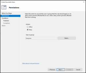 Click Next. Select Deny for denying certain files from getting executed. By default, rules applies to everyone, you can select User or Group as per the need: