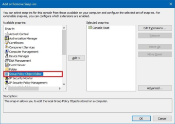 3. Under the "Available snap-ins" section, select “Group Policy Object Editor snap-in” and click on the “Add” button.