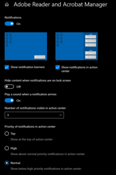 Once we are in this area, we can see exactly what programs are capable of sending notifications, as well as where we are notified and if we want to dial back the messages from Microsoft as well. In the example shown above, we see that Adobe Reader is sending Update notifications pretty regularly right now. However if we have a very specific version of Adobe Reader that we must continue to run at, we may not necessarily need these notifications. Therefore, if we click on the Adobe Reader notification at the bottom, we can either turn it off entirely with the switch, or dial it in for particular settings.