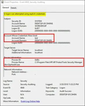 As we can see in the above screenshot, the account named "test" is being used to login explicitly. The process name DpHostW.exe is the file that is associated with HP ProtectTools Security Manager.