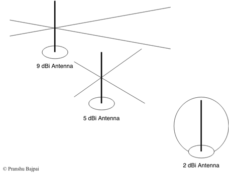 Antenna Gain: Do not be confused by this term, the antenna does not actually amplify anything. Antenna gain is a figure that reflects how efficiently your receiving antenna would convert Wi-Fi radio waves into electrical power. Antennas with a gain of 2 dBi, 5 dBi, 7dBi, 9 dBi, 13 dBi etc are available. A common mistake is to think that the one with a high dBi would be the best (e.g. 13 dBi). To understand why this is a misconception, consider the following rough sketch [Figure 1]: