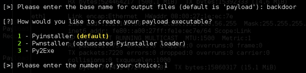 Next, it will ask us to enter a name for the payload. I named it "backdoor". As mentioned earlier, Veil converts python files to exe. It asks us to choose which tool we want to use for this process. Personally, I like Pyinstaller and I am going for it with option 1. These two steps are shown below.