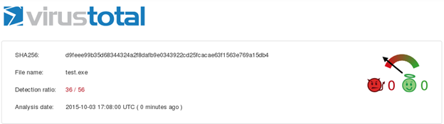 Let us scan the payload "test.exe" through virustotal.com as shown below.