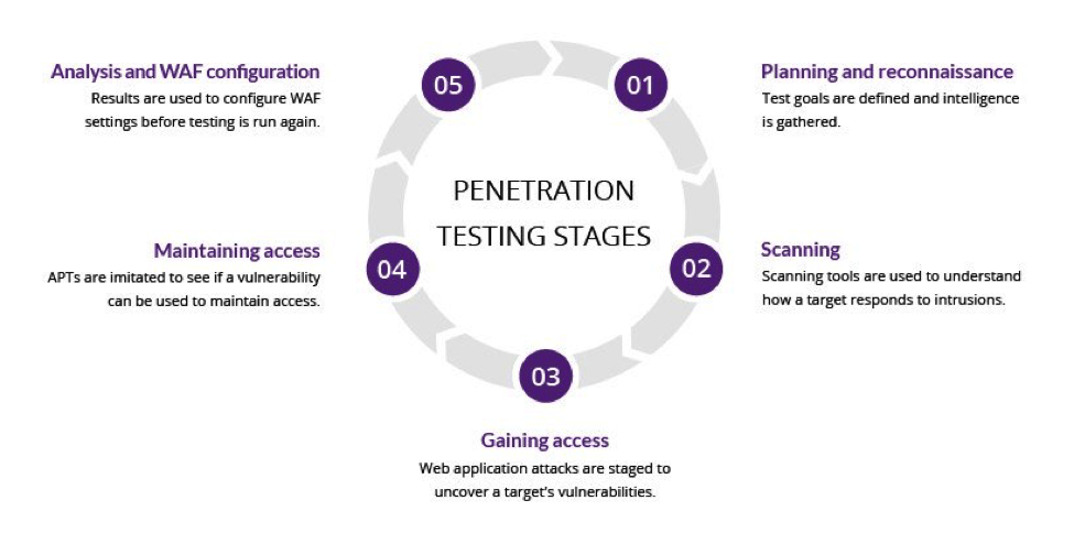 Pen testing involves a few stages: