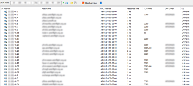 We then started to perform basic network-discovery scanning and enumeration on the identified name server's network range. (ie *.*.40.1-254) .For this, we will use the netscan tool. The netscan is a very helpful tool to perform network reconnaissance. It has a very simple interface, checks for common open ports, supports credentialed login and give the results in very user-friendly format.