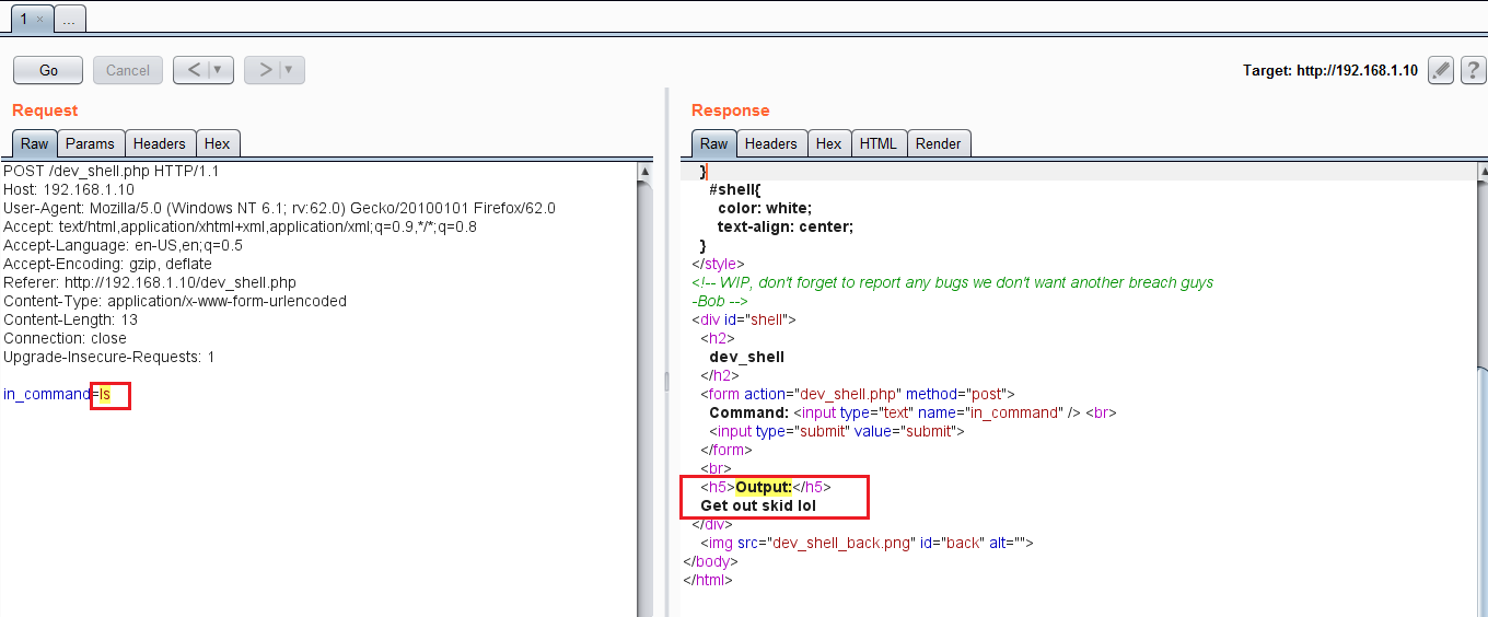 As can be seen in the above screenshot, the shell returned a response to << ls >> command as “Get out” and did not return the command output on the server. It means there are some restrictions implemented on the server, as a result of which we are able to run only some selected commands.