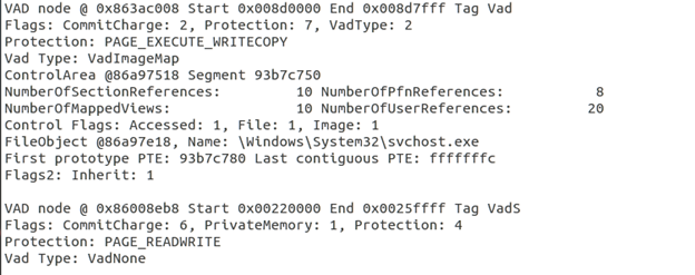 - Vadinfo: This plugin helps us to find what each memory range corresponds to, what its protection settings looks like etc. For example below is a snapshot from two consecutive VAD regions for this process.