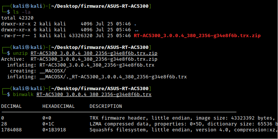 In this laboratory, we will use the model RT-AC5300 from Asus. To see the files embedded in the firmware file, we need to use the binwalk tool. Using the option "-e," all the files can be extracted from the .trx file. [CLICK IMAGES TO ENLARGE]