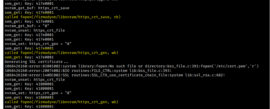 As observed, the next step is the creation of a certificate into the /etc/cert.pem folder. From this point on, there are no secrets. We need to track all the errors we get to launch the router's landing page.