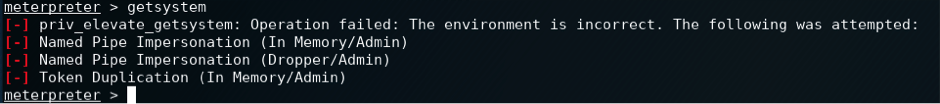 Metasploit by default provides us with some methods that allow us to elevate our privileges. On the Meterpreter prompt, we use the getsystem command, as shown below: