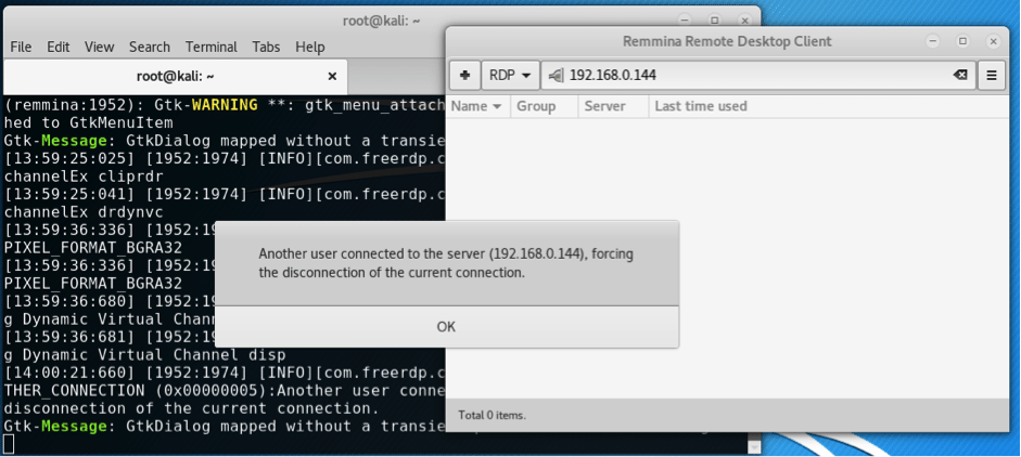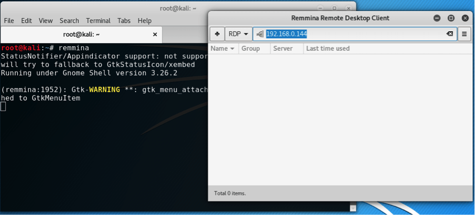From the Kali Linux machine, we can use the remmina remote connection client. If it is not installed within Kali, you can install it by typing the following command: