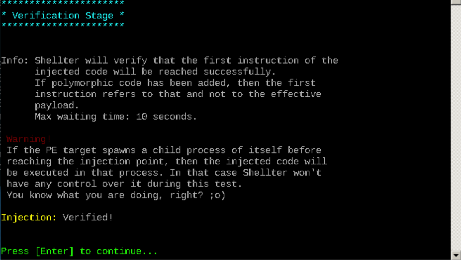 Enter LHOST and LPORT and press Enter. Shellter will run to completion and request you to press Enter.