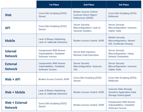 While Cobalt’s pentests were primarily focused on web apps and APIs, it also has data regarding mobile devices, internal and external networks, and the combinations of web plus APIs, mobile and external networks. The table below identifies the three most common findings for each of these categories.