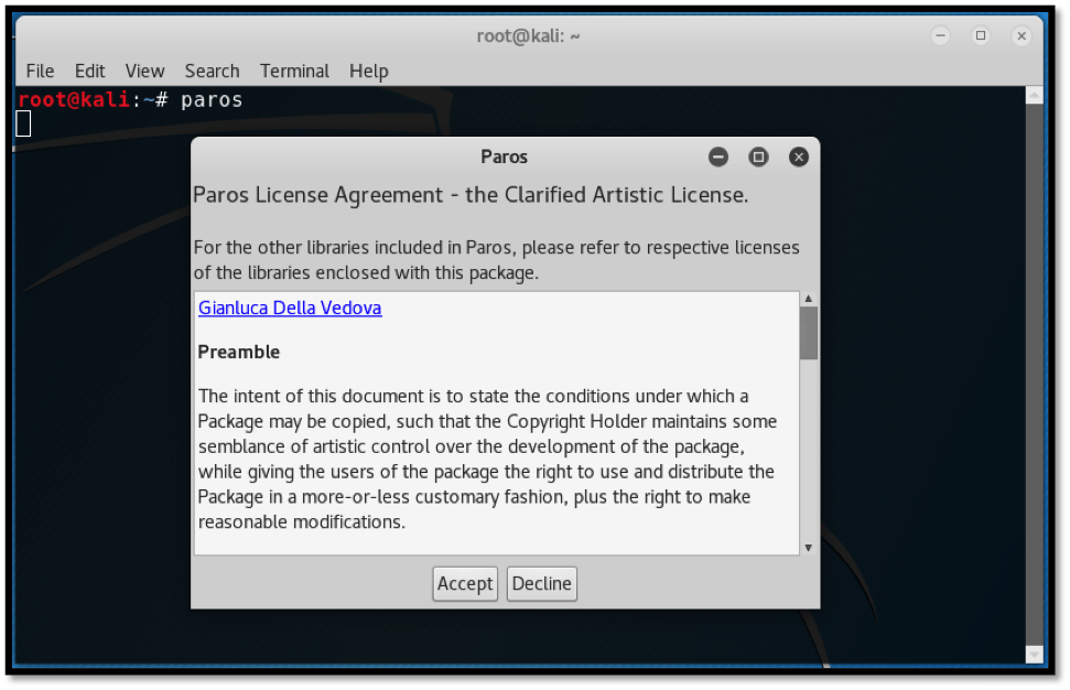 Kali Linux ships by default with Paros since the Kali Rolling Edition. Launching the tool is as simple as typing “paros” on the terminal. This is shown below: