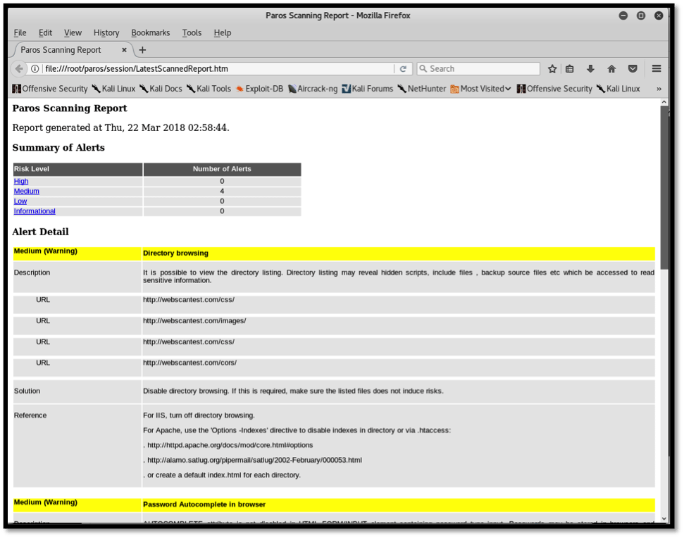 We open the file with our browser and we can view the results in detail. Paros categorizes the identified issues according to risk rating. Our last scan session resulted in four medium risk issues as can be seen in the screenshot below: