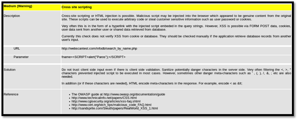 For some vulnerabilities, Paros shares the affected URL and payload used during parameter injection. This can be seen in the screenshot above, obtained from an XSS identification.