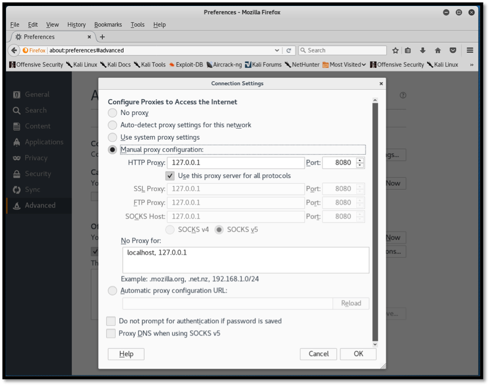 Before we can attack a web application, it is important to set a proxy in order to allow Paros to intercept traffic between our browser and target website. We do this by launching our browser on Kali Linux. In this case, we are using “Firefox ESR” on Kali Rolling. From the three lines on the top right-hand section of the browser, we select “preferences,” then “Advanced.” Finally, under the “Network” tab we click on “Settings” and configure our proxy settings as shown in the screenshot below: