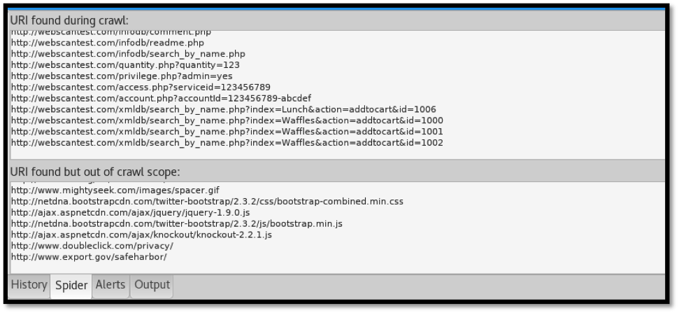 Bottom Section: This section displays the responses from the crawling and scans performed on the target website. This section contains the history, spider, alerts and output tabs that display information depending on the activity being executed against the target website.