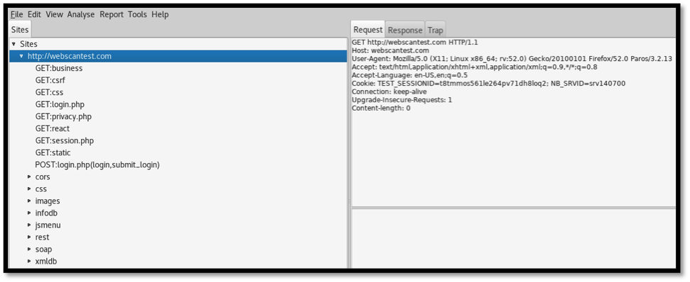 Right Section: This section displays the requests and responses to each request made to the target website. Requests can be trapped, modified and re-sent, thus allowing various tests to be initiated within the website parameters.