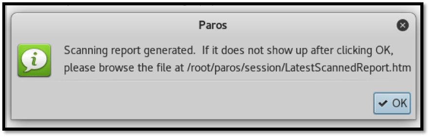 Once the scan is complete, the results are automatically saved as an HTML file within the Kali Linux system. As we can see below, the scan duration was 726 seconds. Paros instructs us to visit “Report,” then “Last Scan Result” on the menu bar.