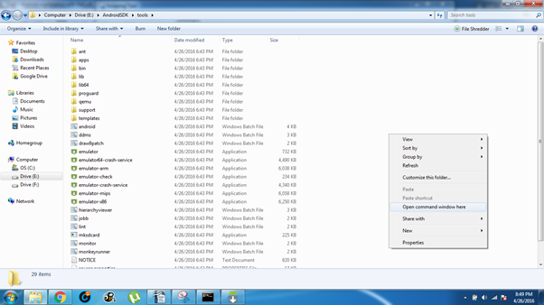 Once the installation is complete, navigate to the Android SDK folder on your system. In my case, it's in E:AndroidSDKtools. Open a command window in that location by holding shift + right click > Open command window here.