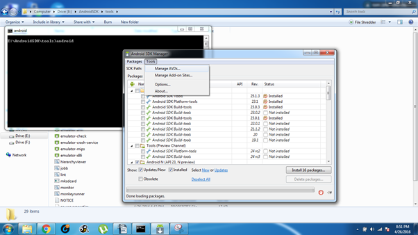 On cmd enter 'Android' and press enter and wait for the Android SDK manager to load. It looks something like this once it's loaded. Once loaded you can go to Tools > Manage AVDs.