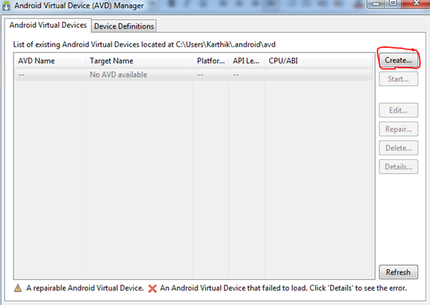On clicking manage your AVDs, should land us to the following screen where we would click on create. This will be the initialization of your emulator.