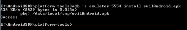 'adb -s emulator-5554 install evilApk.apk' this indicates to adb that on device id: emulator-5554, installation of evilApk.apk is desired.