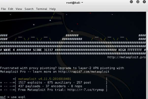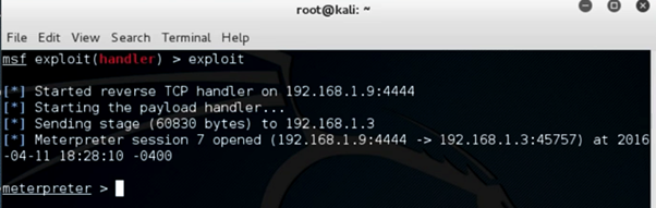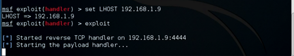 In Metasploit, use command uses a particular model of the framework. In this case, we wish to use the multi/handler exploit, which facilitates listening to an incoming wildcard connection.