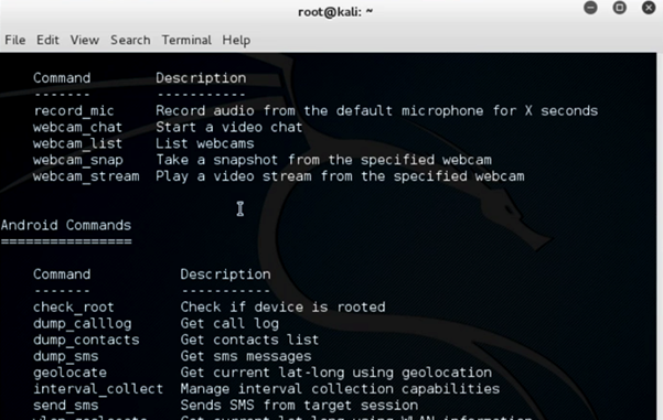 This is the most basic command which enlists all the commands provided by meterpreter to be used at your disposal.