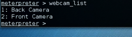 We can use, webcam_snap 1 or webcam_snap 2 commands to interact with the front or back camera of the device.