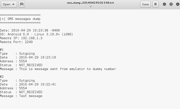 dump_sms command dumps SMS into a text file on your Kali Linux home directory. Let's have a look at that command in the below screenshots.