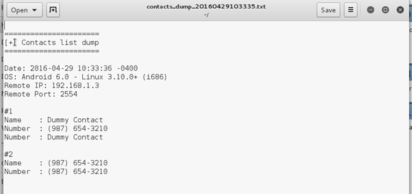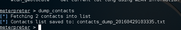 Contacts from contact lists are dumped into a text file on the Kali system. We can have a look at these commands below.